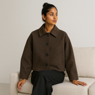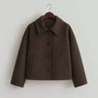 This jacket features a relaxed, boxy silhouette with a classic button front. The straight cut and wide collar make it perfect for daily styling and layering.