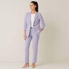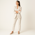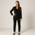 This set includes a tailored blazer with a lapel collar and slim-cut trousers with a classic design. It is a refined option for professional settings and formal events.