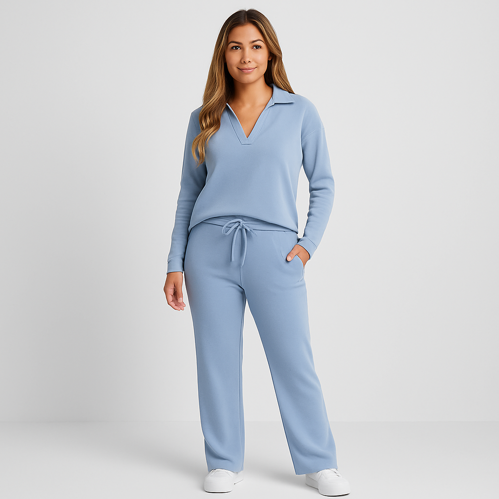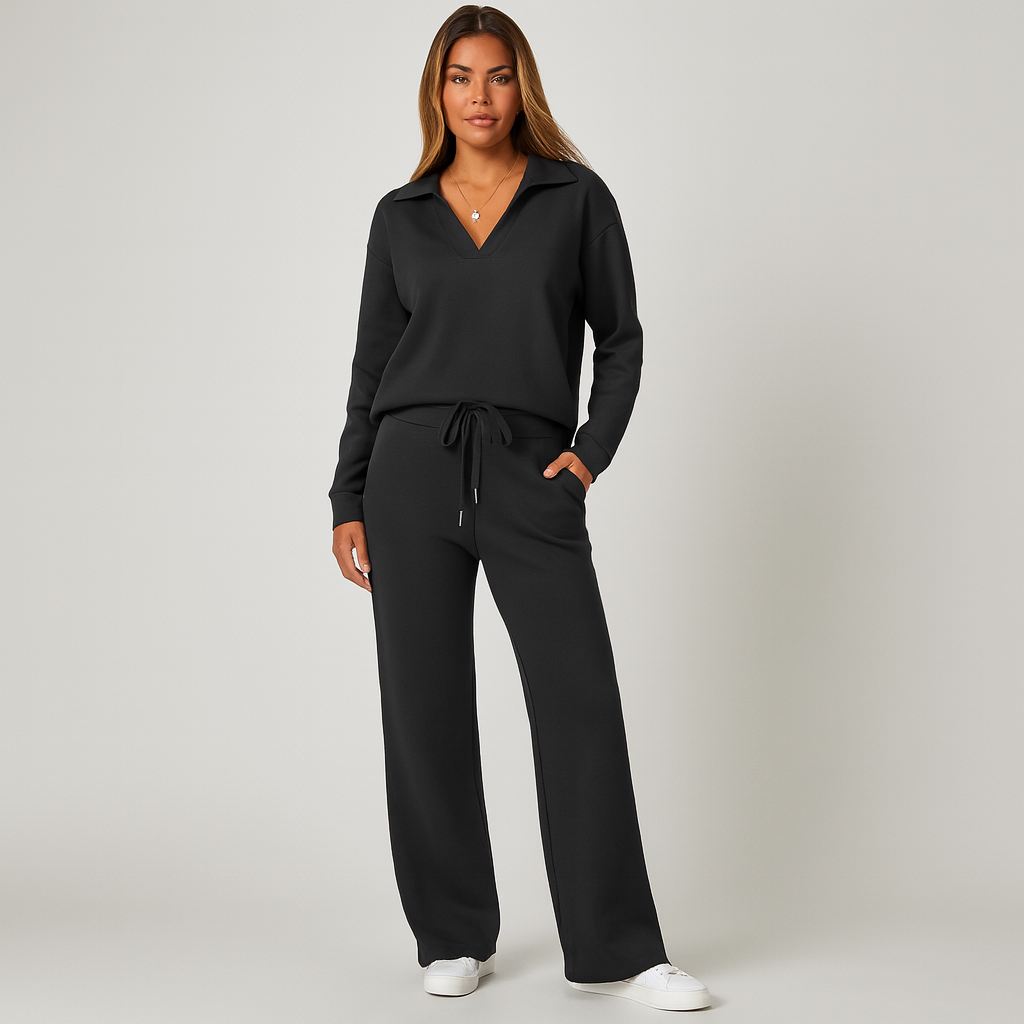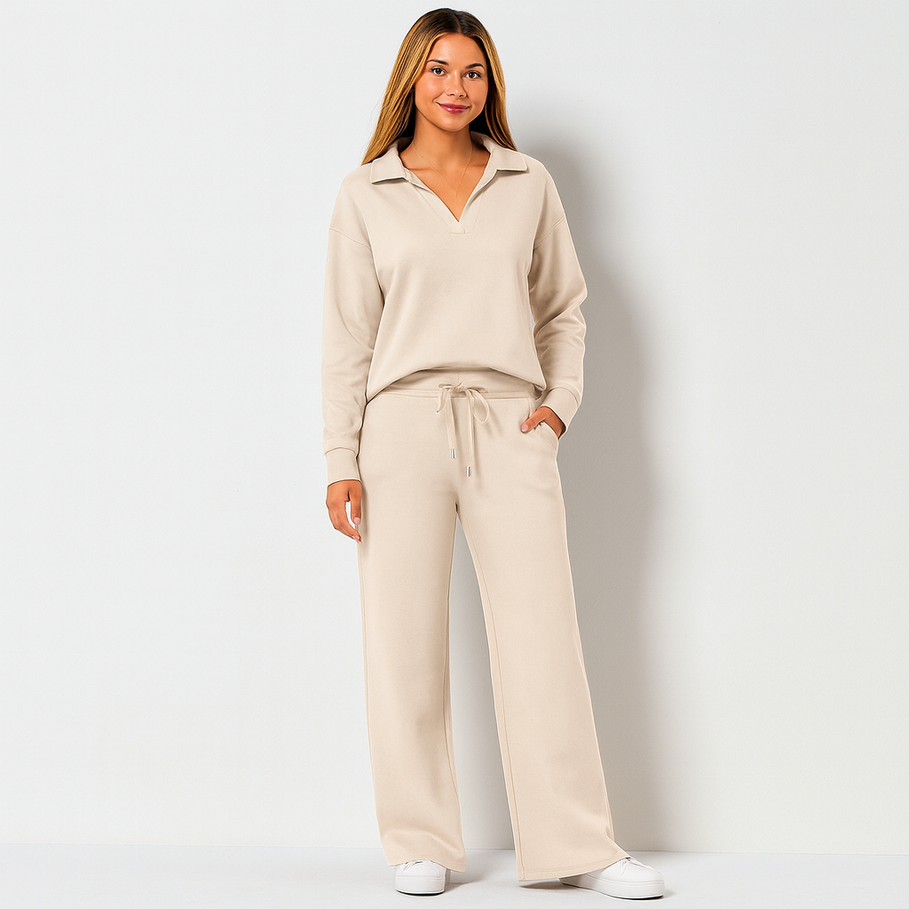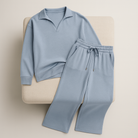 The set blends functionality and simplicity in one look. With a relaxed pullover and wide-leg pants, it’s perfect for moments of calm at home or while on the go.