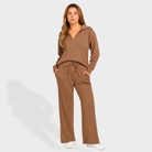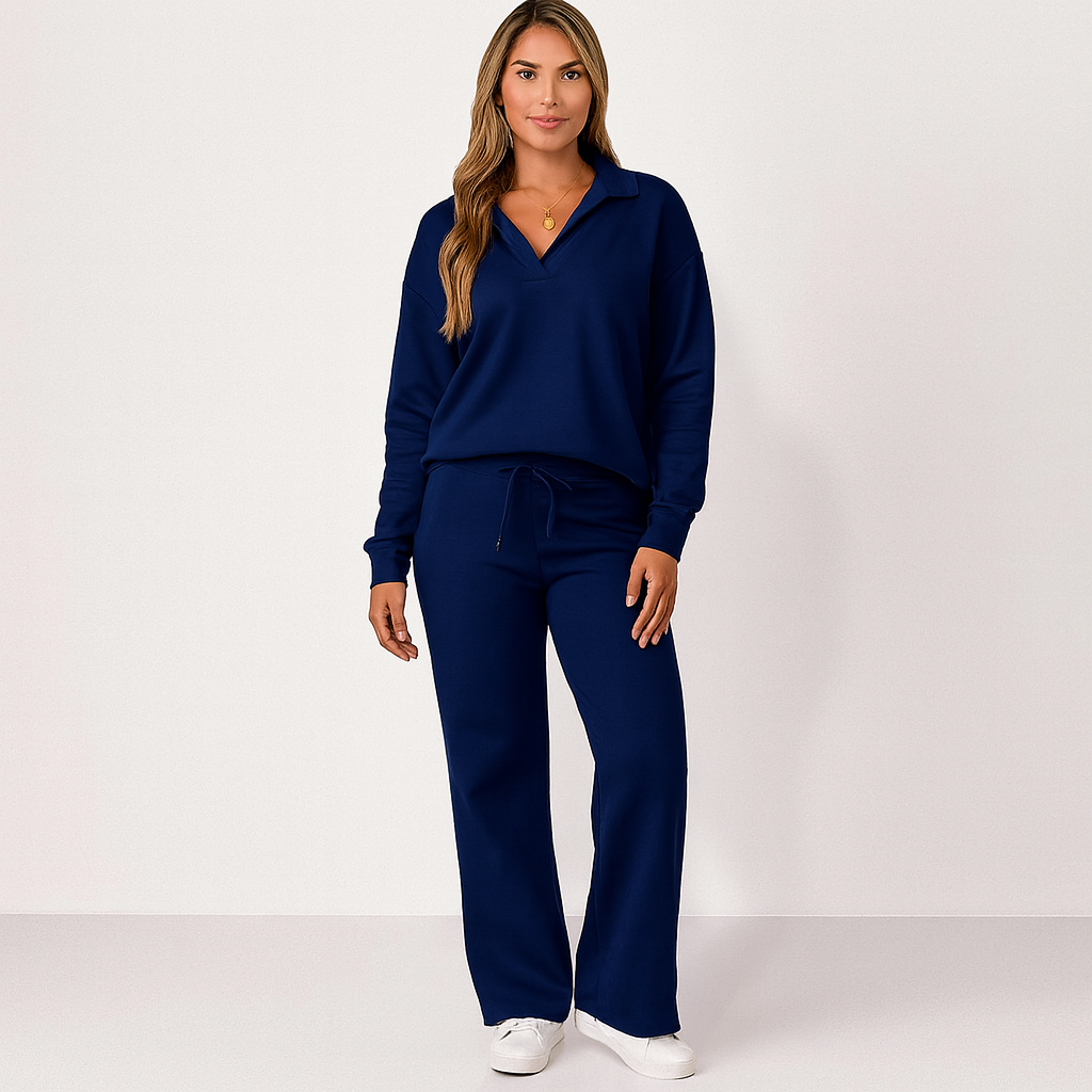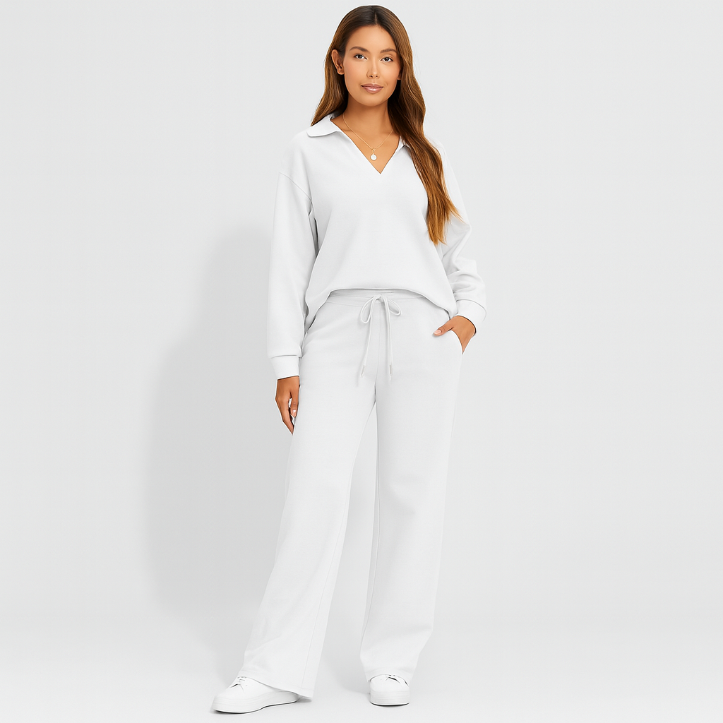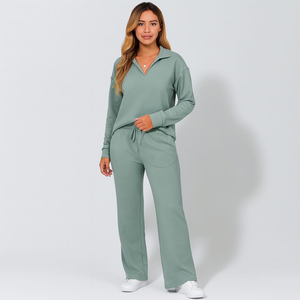 The set blends functionality and simplicity in one look. With a relaxed pullover and wide-leg pants, it’s perfect for moments of calm at home or while on the go.