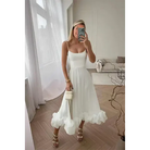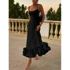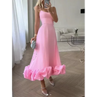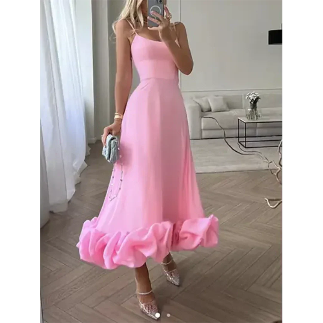 This women’s sleeveless ruffle hem dress with spaghetti straps is ideal for weddings, summer parties, and formal evenings. The flared hemline creates elegant movement, while the lightweight cut adapts seamlessly from day celebrations to evening events.